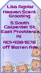 | Hi Sonia & group, I have taken baby Pebbles to 3 different groomers. Then I saw the posting for Heaven Scent. Lisa is awesome, very caring, does just what you want. You don't have to leave your dog for hours, and you can stay and watch if you want. It's a bit of a drive, but it is worth it. Her mom also has a place in Swansey *sp lol Ma. The prices are incrediable. Cannot really quote because each dog is different. I highly recomend Lisa and her Mom. Thank you Lisa and to the nice person who posted the message. Thanks happy Mom!! ~ Ann L. Norton, Ma ~ |