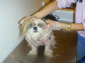 | she is about 2 years old not fixed was living in a cat carrier the smallest one i ever saw she has mange a nasty allergy to fleas and her nails are about 6in long her poor little feet are raw her pads should be nice and black they are red and blistered she was dumped off at faxon animal shelter and when i got the call i went as fast as i could. she was taken to the vet for treatment. Right now she is on meds, fish & potato food. if anyone has any advice of this kind of stuff please PLEASE email me NanukeShihtzu I will appreciate any help i can get to help this poor lit girl... |