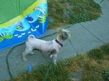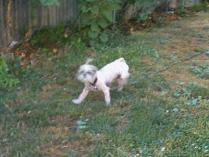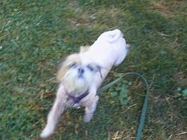 | melony doesn't know how to climb up or down stairs this dog has lived in a cat carrier for 2 years. i put her on a 30 foot leash and hooked it to my clothes line so she has the run of the entire yard i didnt want to forse her to do anything. i walked around the yard so she could follow me if she wanted, (instead of me pulling a leash) well this lit angel is so scared to be in the world she is right on my heals.i cant get over how she isnt scared of me. some rescue dogs are so scared of people that it takes me a good 4 months to get their trust. |