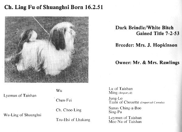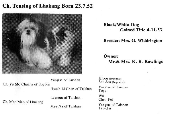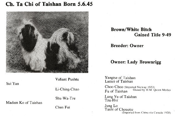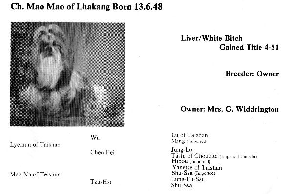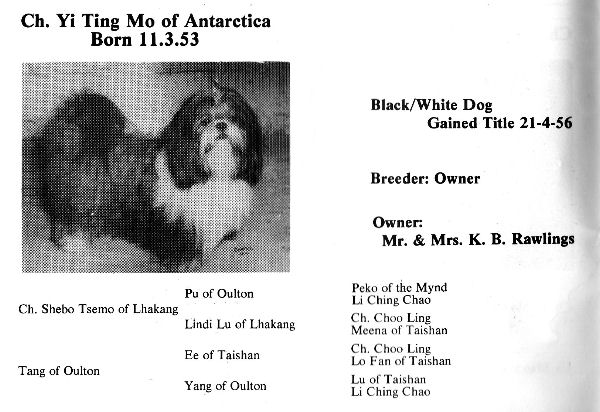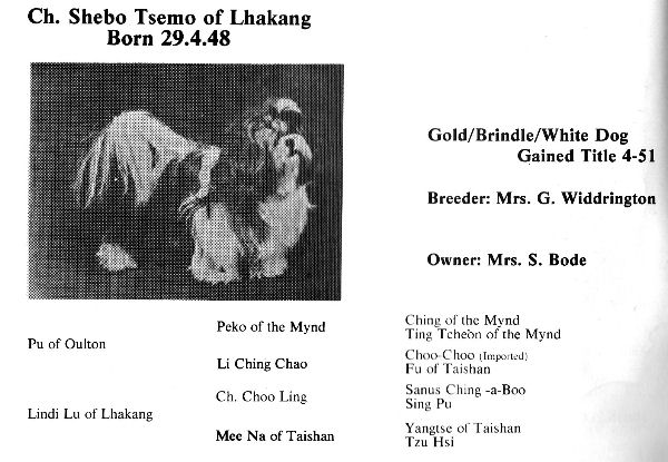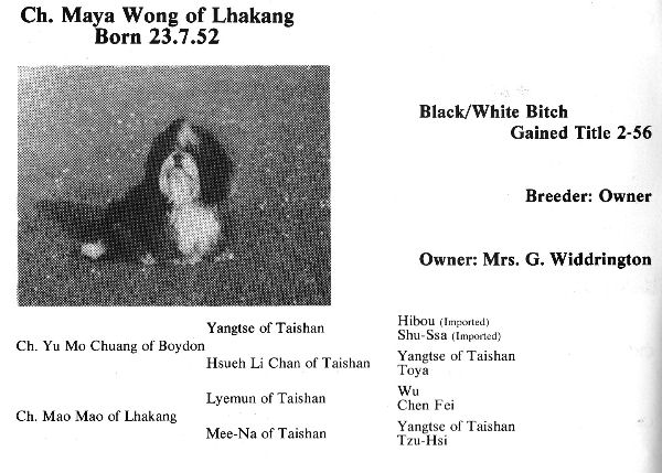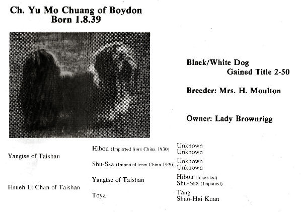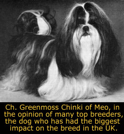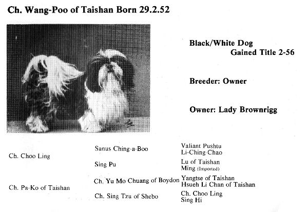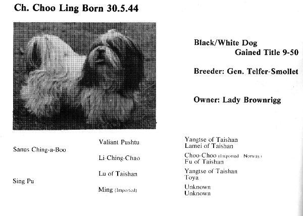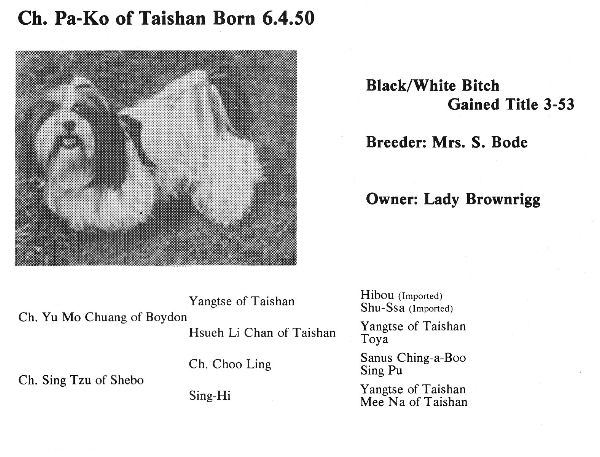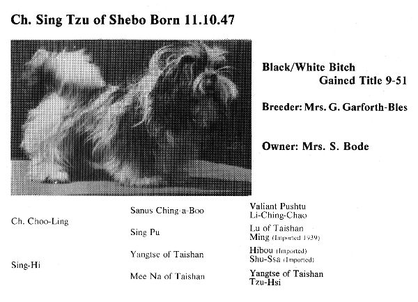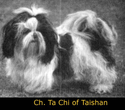 | Initial interest in the Shih Tzu in England commenced in 1930. Several shaggy dogs were imported from China by General Sir Douglas and Lady Brownrigg. Although classed as "Apsos", it was quite obvious to the initiated, when they made their appearance in the show ring, that they were a similar but different breed. Although their shaggy coats resembled that of the Lhasa Apso, their noses were much shorter and so were their legs, while their skulls were considerably wider. Also, the Brownriggs' dogs were smaller and more compact with faces like "chrysanthemums". In 1933 a few Shih Tzu were shown at the Cheltenham show, and the following year, the Kennel Club permitted the Apso and Lion Dog Club to change its name to Shih Tzu (Tibetan Lion Dog) Club. Soon after this, the club ruled that the dogs from China were not Apsos, but were Shih Tzu. By 1935 the Tibetan Lion Dog part was omitted and The Shih Tzu Club of England was born under the Presidency of the Countess of Essex, with Lady Brownrigg serving as Secretary. During the next four years the club thrived and grew strong until the outbreak of war in September 1939. World War II seriously curtailed all purebred dog activity in Britain for ten years and, although the Shih Tzu breed was granted separate register on May 7 1940, and became eligible for Challenge Certificates, none were awarded until 1949. The first English champion was Lady Brownrigg's Ch Ta Chi of Taishan. Other Shih Tzu owned by the Brownriggs were Hibou, Shu Ssa, Yangtse and Tzu Hsi. They acquired their first pair when the General was stationed in Peking. Hibou was a dog, and Shu Ssa was a bitch. Shu Sa had her first litter by Hibou in China and her second litter, also by Hibou, when she was in quarantine upon their return to England. Yangtse was born in this second litter and Tzu Hsi was whelped sometime later. Hibou and Shu Ssa, along with another Shih Tzu dog imported from China by Miss Madeleine Hutchins, Lung-Fu Sssu, to Ireland became the foundation stock of present Shih Tzu and the well known Taishan strain, and may be found at the beginning of almost every extended pedigree. Later imports were bred back to the original strain to consolidate type. Other imported dogs which were successfully bred from are: Tashi of Chouette, a bitch brought to England by the Earl of Essex in 1938, Choo-Coo, a dog presented to Her Majesty the Queen Mother 1933, and three bitches imported by Gen. Telfer Smollett: Ming, 1939, Ishuh Tzu, 1948 and Hsing-Erh, 1952. From 1930 to the end of 1955, nearly 700 Shih Tzu were registered with the Kennel Club. The breed was exported to America, Canada, Australia and many countries in Europe where they were shown and bred. Championship status was granted in 1940, when most of the Shih Tzu in England were conforming to the original type. By 1956 thirteen dogs held the championship title. These were: Ch Ta Chi of Taishan (b) Ch Pa-Ko of Taishan (b) Ch Yu Mo Chuang of Boydon (d) Ch Choo-Ling (d) Ch Sing-Tzu of Shebo (b) Ch Shebo Tsemo of Lhakang (d) Ch Mao-Mao of Lhakang (b) Ch Tensing of Lhakang (d) Ch Ling-Fu of Shuanghsi (b) Ch Hong of Hungjao (d) Ch Maya Wong of Lhakang (b) Ch Wang-Poo of Taishan (d) Ch Yi Ting Mo of Antarctica (d) Audrey Dadds, in her charming book, The Shih Tzu, gives Lady Brownrigg credit for naming the Shih Tzu the "Chrysanthemum" dog. Almost thirty years after she brought her first pair, she described Shu Ssa as follows: She was white with a black patch on her side, root of tail and head. This had a white topknot or applemark. Her hair was not as long as it became, but it stuck up all around her face, and with her large eyes she looked like a fluffy baby owl or perhaps a chrysanthemum!" A most appropriate and descriptive name for the Shih Tzu breed. Another person who was captivated by the charm of the Shih Tzu was Mrs Audrey Fowler. During the winter of 1936-37 she went to China and on route there she tried to obtain one. She made many expeditions to weird quarters of Hong Kong and Shanghai where she met many rickshaw boys saying with their usual cheerful smile, "We find you little doggie!" But they never did. When she arrived in Peking, she met the Comtesse d'Anjou, and there in the courtyard of her house in Legation Street were her dream dogs-small honey-and-gold-coloured shaggy dogs. The Comtesse had only one golden and white female puppy of the right age to undertake the strenuous journey back to England, but finally she was able to find a second dog, a little honey-coloured bitch from another breeder. She brought these two Shih Tzu back to England with her in 1937 and was one of the last fanciers to have seen the breed in China. She treasures the registration cards from the Peking Kennel Club of her first two Shih Tzu - Nui Sand and Fu Tzu. In England Mrs Fowler was one of the few breeders to breed for a clear, deep gold, and she exported some of the first Shih Tzu to the United States. Both Margaret Murdock, one of the earliest breeders in America, and Mary Frothingham bought their original breeding and show stock from Mrs Fowler. We know of two other Shih Tzu that came out of China in 1949. A British couple, who were fleeing from China just before the advance of the Red Army, took with them a lovely camel-coloured dog with a luxuriant coat, called Wuffles, and Mai-Ting, a black and white bitch. Mai Ting was bred to Wuffles and a single black and white puppy was whelped in October 1950. A couple of years later, Wuffles was tragically killed by a truck. The last recorded Shih Tzu to leave China was a bitch, Hsi-Li-Ya. imported to England by a Mr Dobson in 1952. None of these dogs contributed much, if anything, that we know of to the Shih Tzu breed. Article taken from "The Joy of Owing a Shih Tzu" by Ann Seranne |